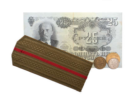 Russian pre-revolutionary, Soviet and Russian modern coins and banknotes on a white background close-up.