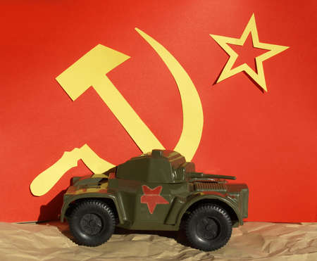 Red star with a sickle and a hammer on a background of fabric. Military attribute.