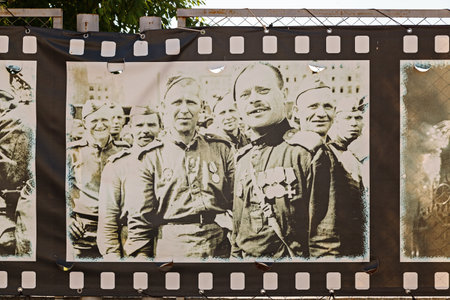 VOLGOGRAD, RUSSIA - April 27, 2019: Banners of photos of World War II. Museum panorama Battle of Stalingrad, Volgograd