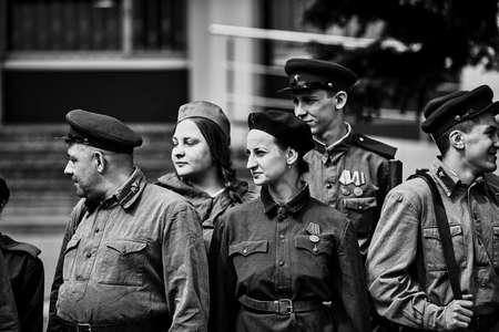 People in military uniform in honor of the Victory Day holiday. Military historical society, reconstruction of the appearance of fighters of the Second World War II. Rostov-on-Don. Russia 09.05.2018