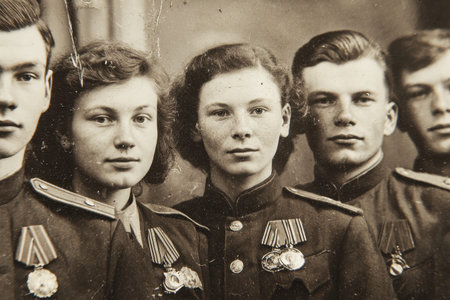 Vintage portrait from Voronezh USSR featuring young soldiers in uniform with medals, capturing the spirit of camaraderie and honor in a historical context