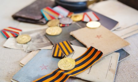 Victory Day. We remember the feat of our ancestors. St. George ribbon, war letters, photographs on a background of red carnations.