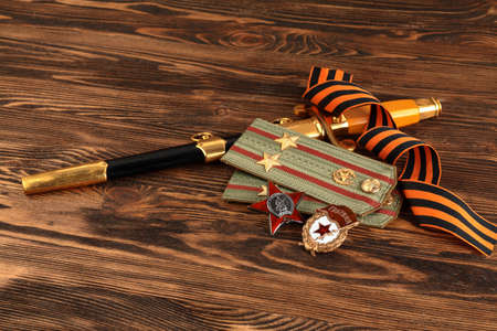 Orders and medals of the veteran on the St. George ribbon. MAY 9 greeting card. Wooden background.