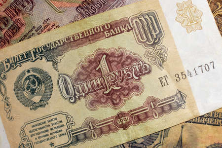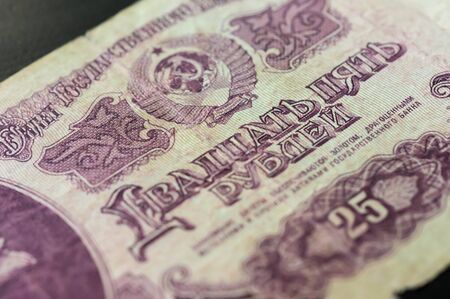 Old money of the USSR close-up. Macro photography of vintage banknotes of the Soviet Union, retro details