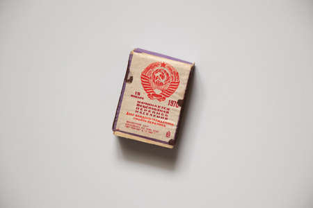 Ukraine Dnepr 20.02.2022 - Old Soviet matches in a wooden box on January 15, 1970 with the hammer and sickle coat of arms, old vintage collection