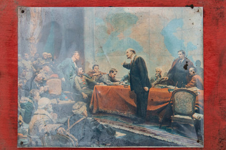 November 1, 2025, Dnipro, Ukraine - An old, faded portrait of Vladimir Lenin and a gathering of people, mounted on a red wooden stand, a symbol of the Soviet era, history, ideology, and propaganda