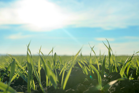 Young green wheat growing in soil. Wheat seedlings growing in a field.
