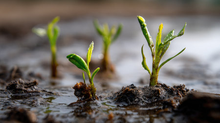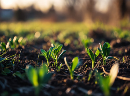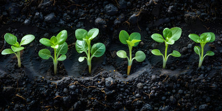 Fresh green seedlings sprout from dark, rich soil, glistening with water droplets, symbolizing growth and new beginnings in a thriving garden ecosystem.