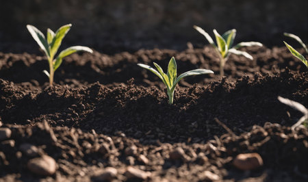 Row of Budding Sprouts Out of Moist Soil - Generative AI.