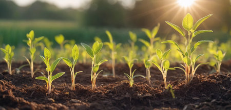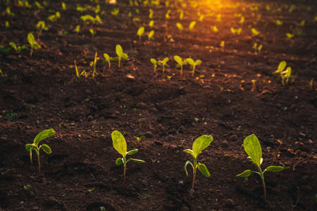 Growing young green corn seedling sprouts in cultivated agricultural farm field under the sunset, shallow depth of field. Agricultural scene with corn sprouts in earth closeup.