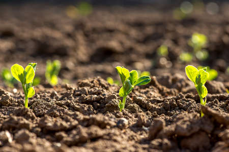 Young pea plants in early spring garden - selective focus, copy spsce