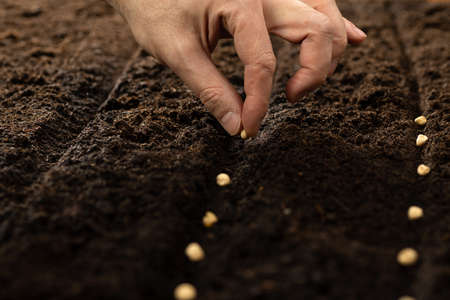 A farmer manually plants green pea seeds in the soil. gardening concept. spring vegetable planting season.