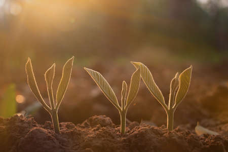 Growing plant,Young plant in the morning light on ground background, New life concept.Small plants on the ground in spring.fresh,seed,Photo fresh and Agriculture concept idea.