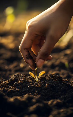 A hand gently planting a young seedling into rich, dark soil, symbolizing growth and connection to nature.