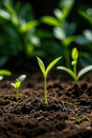 A close-up view of a vibrant green seedling emerging through dark soil, illuminated by soft natural light, symbolizing new beginnings and the promise of growth.