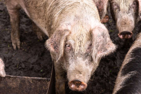 Pig on the farm. Bad conditions, pets a