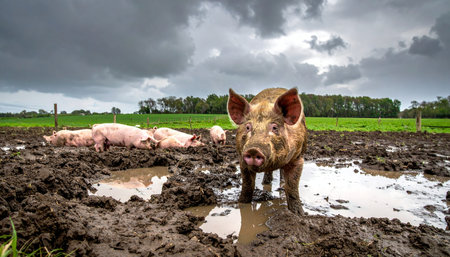 Under a dramatic, stormy sky, a curious pig pauses in a muddy field, its gaze fixed forward. In the background, its companions rest contentedly in the cool mud, embodying a scene of authentic, free-range farm life, raw and unfiltered.