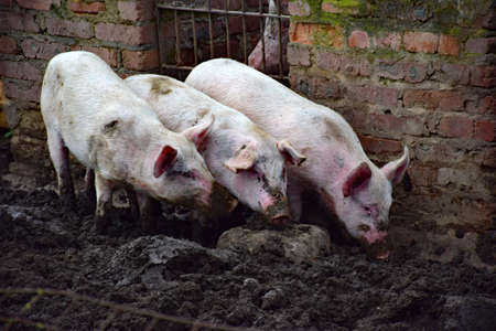 Three wild boars in the mud. Wild piglet in the farm.