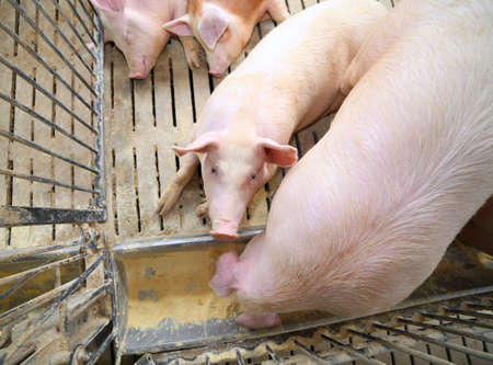 Pink skin of small piglet waiting feed on the farm. Happy pigs on a pig farm in swine business in tidy and clean indoor housing farm, Livestock breeding. Group of pigs in a farmyard, Swine at the farm