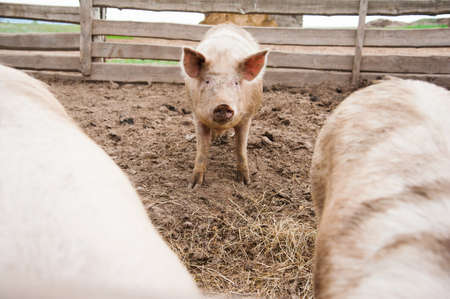 A small piglet in the farm. Swine in a stall.