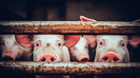 Pigs waiting feed,pig indoor on a farm yard. swine in the stall --ar 16:9 --v 6 Job ID: 01d3020f-9b58-4886-83bd-9b6e5161e263