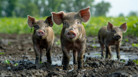 Three young pigs standing in mud in a natural setting, looking curiously at the camera.
