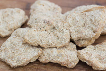 Soybean meat, chunks in a rustic pan. Top view of raw soybeans chunks on rustic wooden background