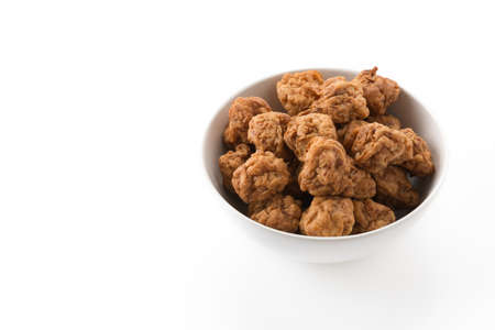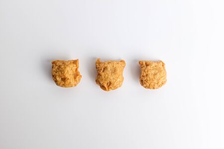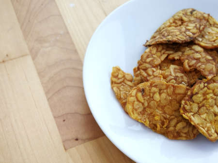 Fried tempe or fermented soybean cake from Indonesia with garnish serve on a plate in white background as conceptual photo
