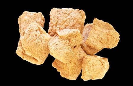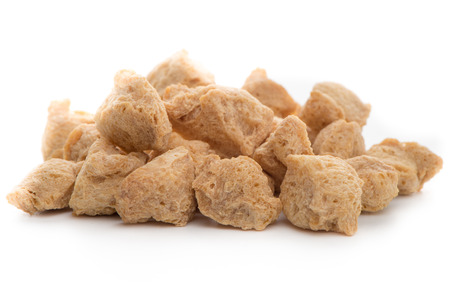 Raw dehydrated soy meat or dry soya chunks in wooden plate on white background. Top view. Copy, empty space for text.