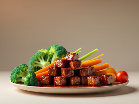 AI Generated. Savory Glazed Meat Cubes with Vegetables