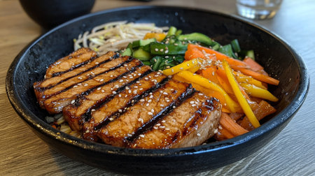 A beautifully presented grilled chicken bowl featuring tender chicken strips, vibrant vegetables, and rice, perfect for a nutritious and flavorful meal experience.