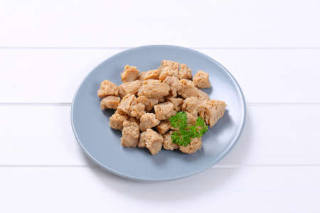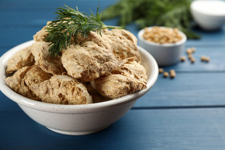 Dehydrated soy meat chunks with dill in bowl on blue wooden table, closeup