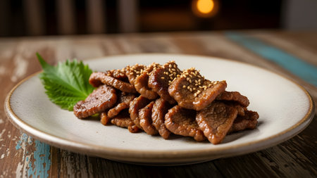 A plate of tender, grilled meat slices, likely Korean Galbi or Bulgogi, glazed with a savory sauce and topped with sesame seeds. The dish is presented on a speckled ceramic plate with a green perilla leaf garnish, sitting on a rustic wooden table.