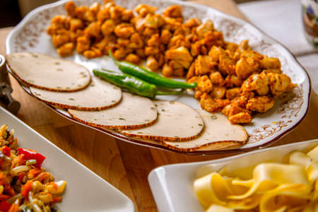 Closeup view of delicious vegan grill burgers and seitan steaks with green vegetables.