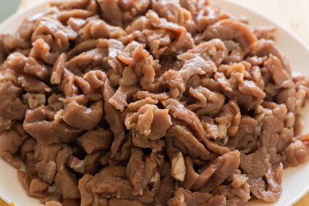 Meat ball on white plate on wooden background, meat ball with pork and ingredient for cooked asian thai food