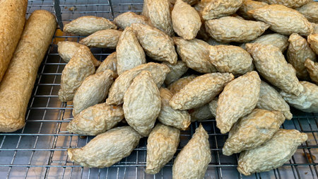 Top view of shrimp ball as a background in the market for sale at Thailand, isolated on black background