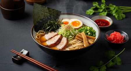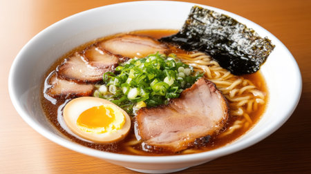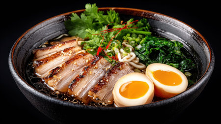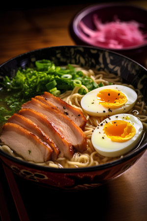 Delicious japanese ramen bowl with pork, eggs, and vegetables.