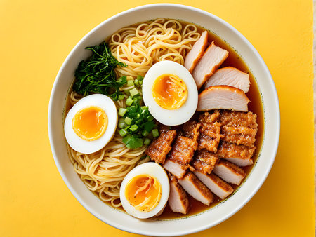 A close-up of a steaming ramen bowl filled with soft-boiled eggs, succulent pork belly, green onions, and noodles in a savory broth, set against a bright yellow background.