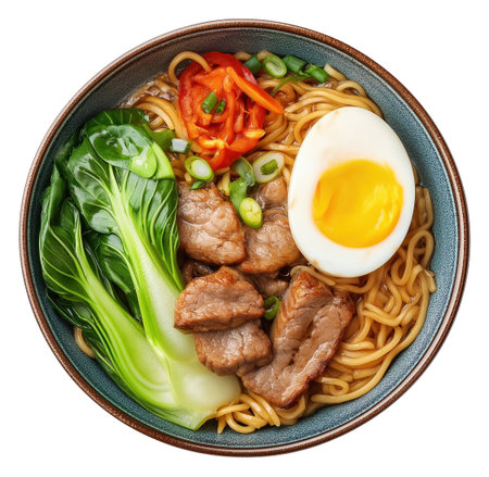 Bowl with noodles, egg, chicken and bok choy cabbage isolated on white background, top view
