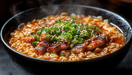 A mouthwatering bowl of ramen featuring tender meat, soft-boiled eggs, and fresh green onions, served steaming hot, perfect for any meal.