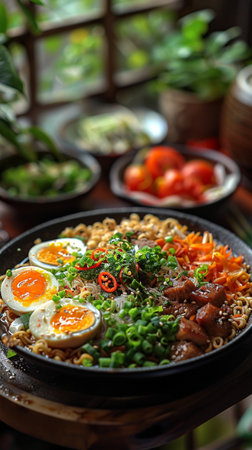 savory ramen noodle bowl with pork, soft-boiled eggs, and garnishes