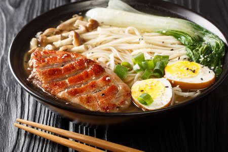 Japanese ramen noodle soup with pork, egg and vegetables in bowl
