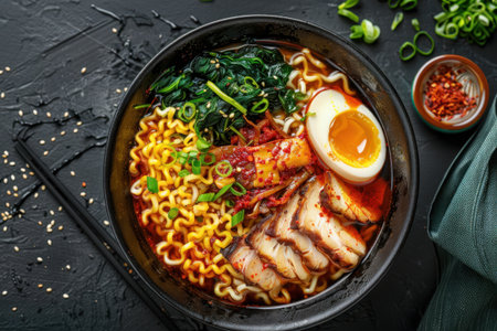 japanese ramen noodle with pork and egg on dark background, Miso Ramen Asian noodles with egg, pork and pak choi cabbage in bowl on dark background, AI Generated