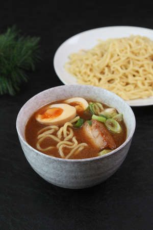 Japanese ramen soup with noodles on dark background. Traditional Asian cuisine
