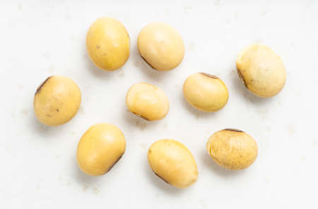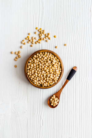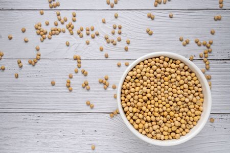 soybeans or soya beans in a bowl on white wooden background. top view. vegan food concept