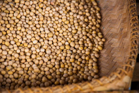 Soya beans harvested in wooden boxes in a warehouse. Natural organic fruit abundance. Healthy and natural food storing and shipping concept.