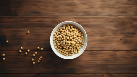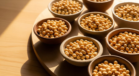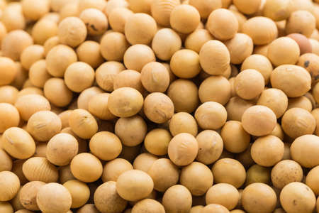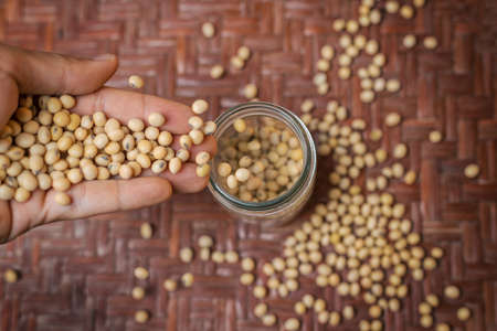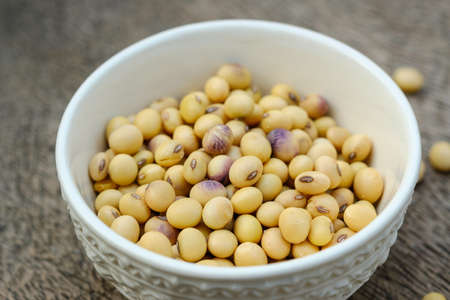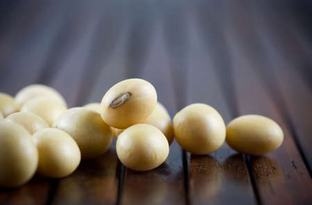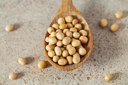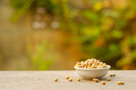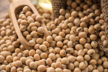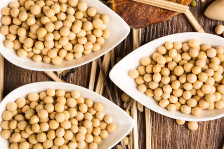 Organic food. Soy diet. Soybean seeds on the kitchen table