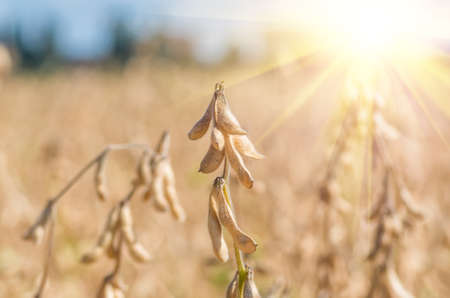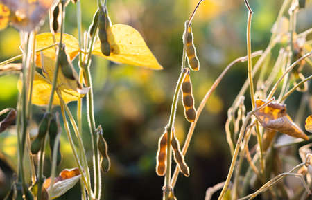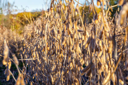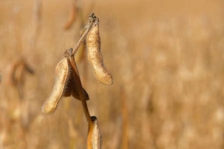 Mature modified soybean pods during the ripening period in yellow field. Soy agriculture. Autumn harvest.