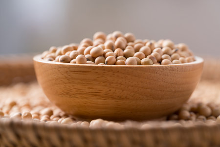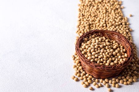 Organic Soybean in basket on wood table. Protein nutrition ingredient for vegetarian.