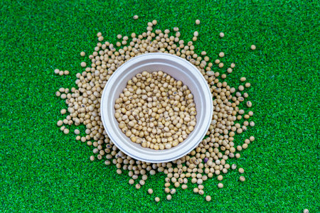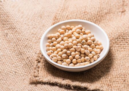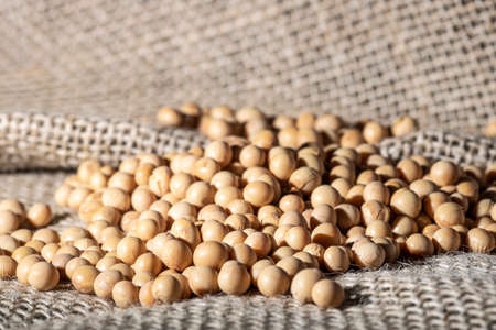 Brazilian soybean seeds on jute background with selective focus in Brazil